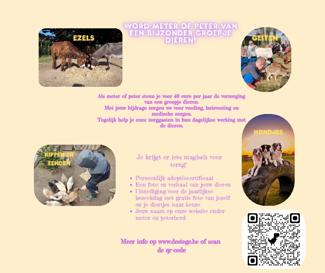 Voor 40 euro per jaar kan je meter of peter worden van een groepje dieren. Je kan kiezen tussen de ezels, geiten, kippen en eenden en honden.